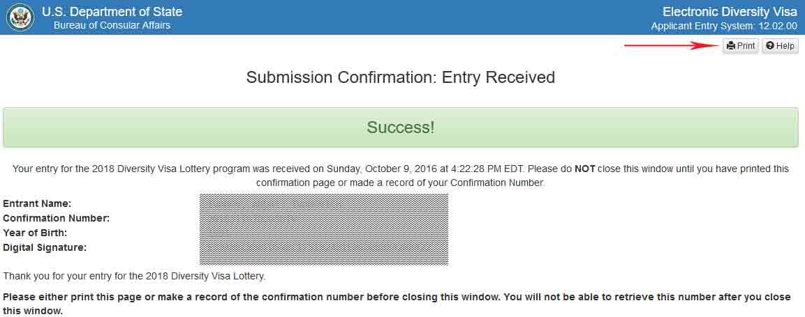 You will then have access to the submission confirmation page. The page is similar to the one shown in the image below. You must save the submission confirmation page in order to be able to check your status in May 2025. You must save the page either electronically (recommended) or print it on paper. By experience, greatyop advises you to save the submission page in PDF and send it by email to a trustful friend, or family member or just save it as a draft in your email. This will save you from a lot of trouble later when you need to check your status.